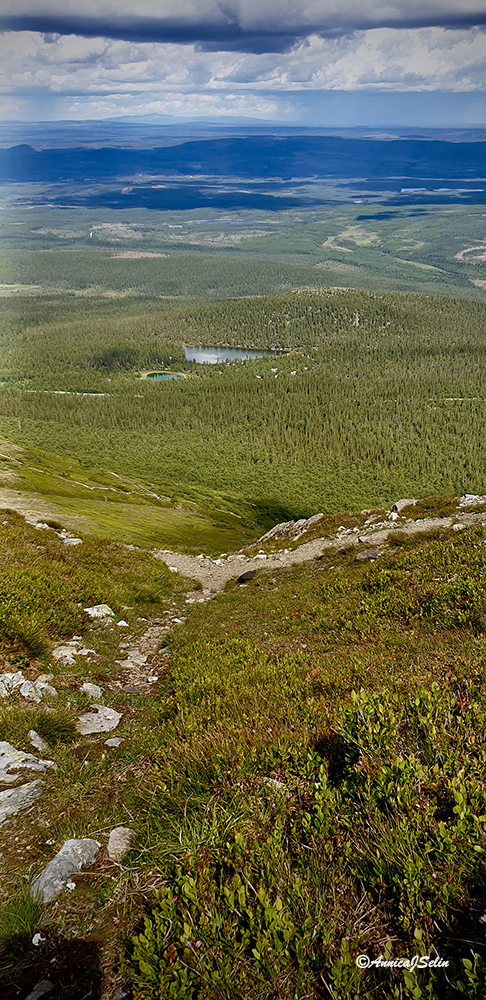 Så efter att vi funderat en stund, bestämde vi oss för att gå mot toppen på Högfjället. Vi tog inte den vanliga markerade stigen upp, utan vi fann oss en väg vid sidan om. Vi fick klättra endel på stora stenblock, och bitvis var det ganska besvärligt. Men vilken utsikt vi fick njuta av. Vilken känsla att sitta högt uppe på ett fjäll och bara njuta av stunden. Det här är livskvalité.