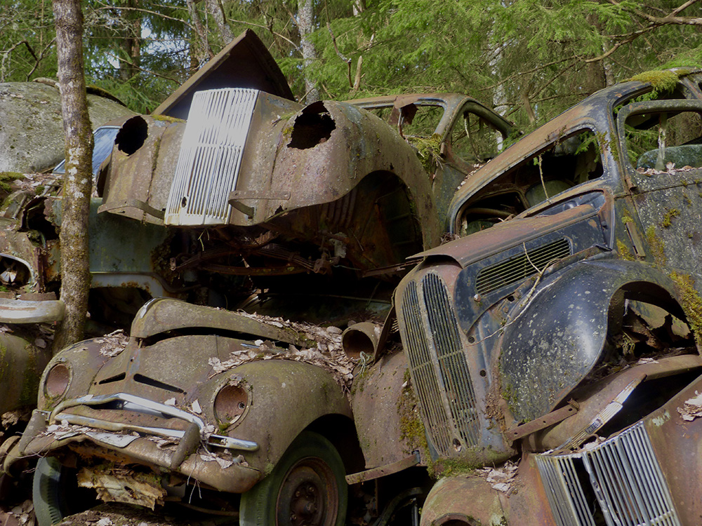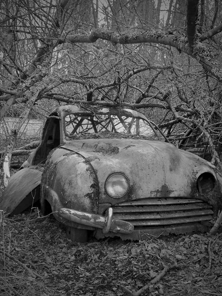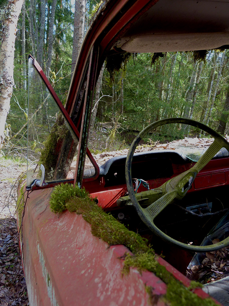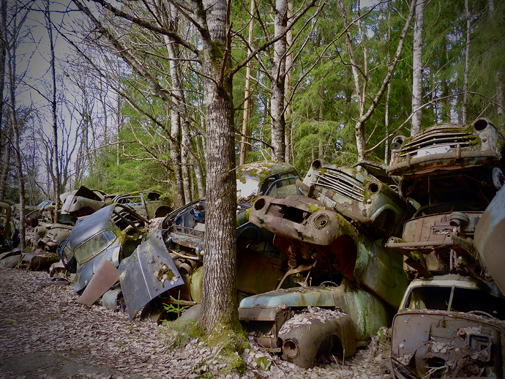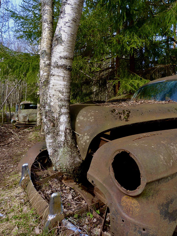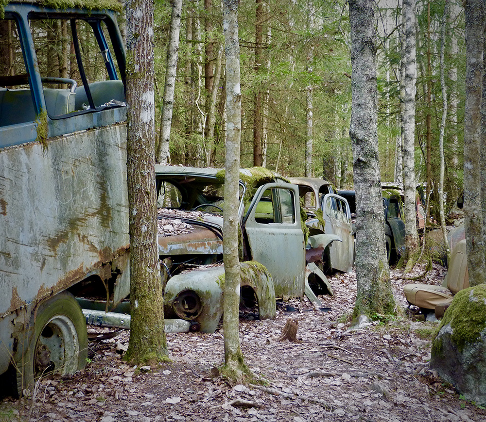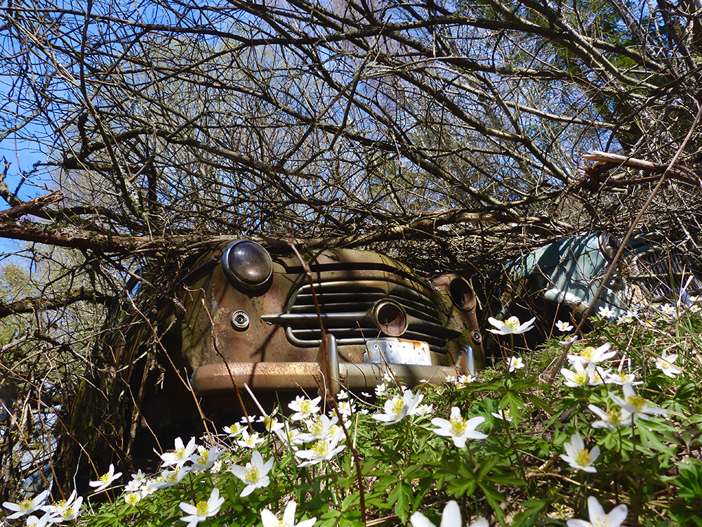 Det växer mossa på många rostiga bilar och träd har hittat sina egna nya vägar att växa, står något i vägen, får man väl växa igenom det…vilken växtkraft.