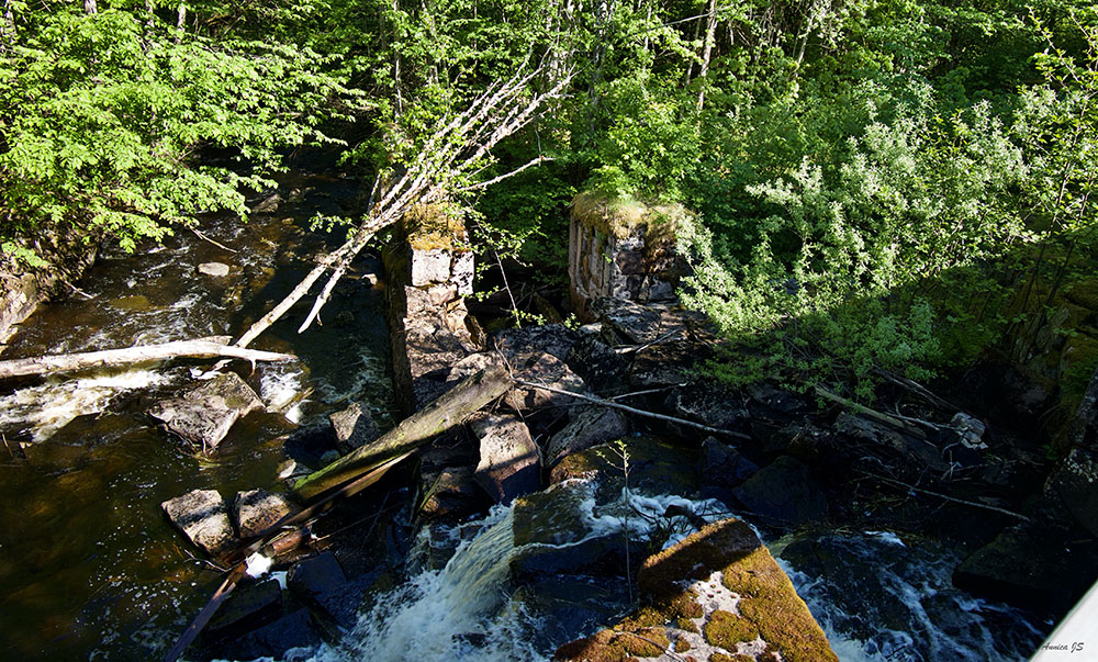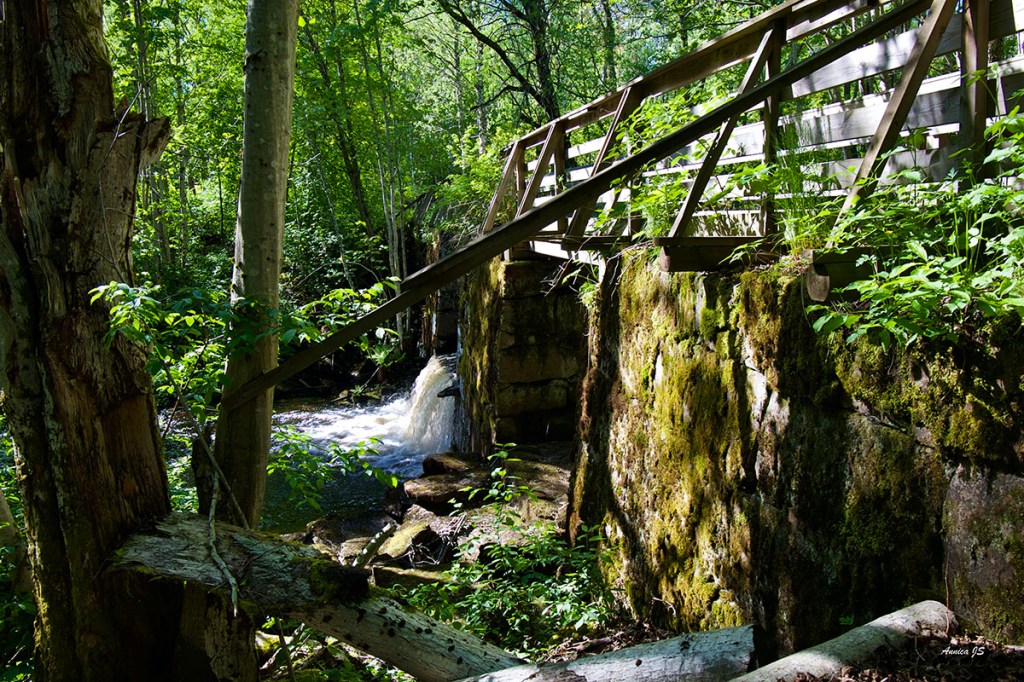 Till vänster om denna bro fanns en såg. Förmodlingen har sågning pågått här sedan 1600-talet. Byggnaden byggdes om och förbättrats ett antal gånger. Sågverksrörelsen fortsatte efter brukets nedläggning. 1912 togs dammen här bort och sågen flyttades längre söderut.