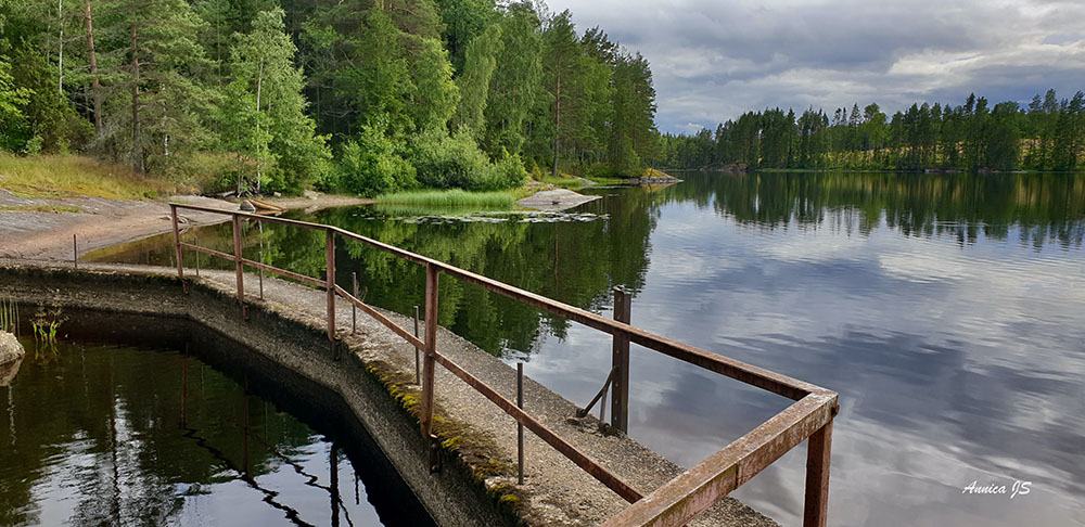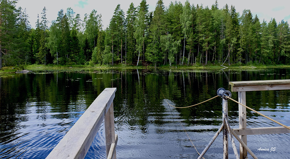 Efter någon kilometer, intill första grillplatsen finns en flotte ”Tant Brun” som man får dra sig över sjön med. På andra sidan sjön fortsätter sen leden.