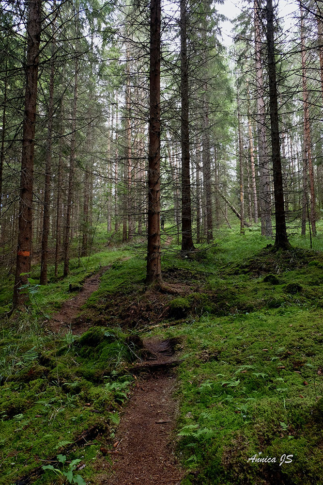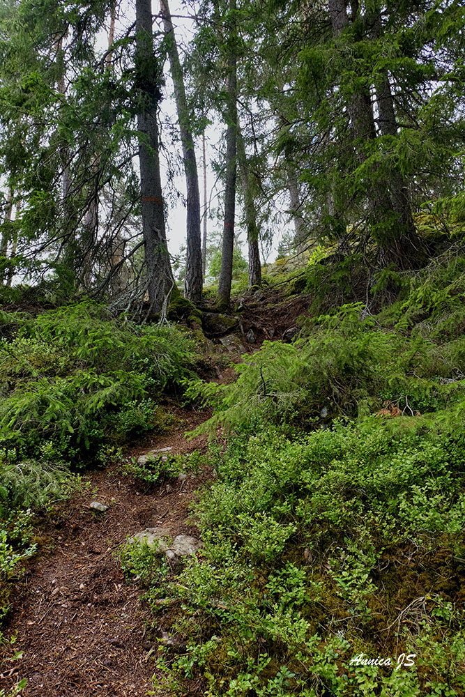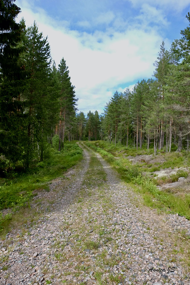 En kortare del av leden går också längs en grusväg, innan den vänder upp i skogen igen.