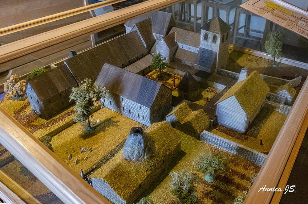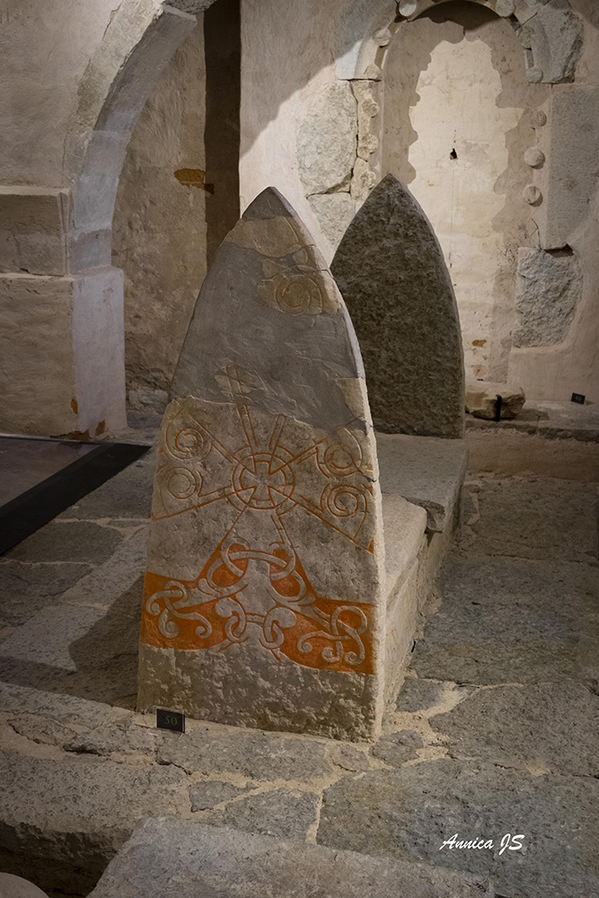 Runristade gravmonumenten har hittats inmurade i den nya stenkyrkan som byggdes kring sekelskiftet 1100. Korsen visar på ett kristet samhälle.